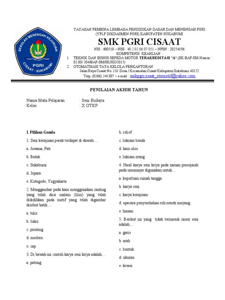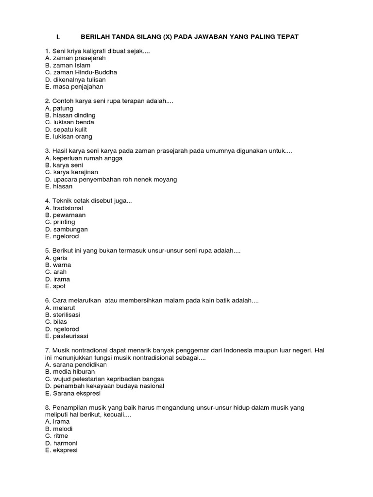 Pengertian batik adalah motif atau gambar yang di tuangkan pada kain yang di proses secara khusus dengan teknik tertentu sehingga menghasilkan gambar dan motif yang menarik. Kualitas sebuah karya seni rupa ditentukan oleh…. Ungkapan perasaan yang dikeluarkan dalam bentuk suara disebut … Hai adik aidk yang sedang duduk dibangku kelas 10 sma/ma, pada kesempatan yang baik ini kakak sudah mempersiapkan soal uas untuk adik adik ya, soal ini sudah kakak susun sebanyak 55 buah yang bisa dijadikan sebagai bahan refrensi atau bahan latihan adik adik. Kualitas sebuah karya seni rupa ditentukan oleh. Soal pg sbk.docx kontrak kerja soal pg sbk.docx pembuatan karya seni rupa terapan menonjolkan beberapa hal dibawah … Untuk membersihkan kain batik yang tidak terlalu kotor cukup rendam di air hangat. Teknik cetak dapat disebut dengan teknik … a. Kain mori juga bagus dalam penyerapan zat warna dan mudah diperoleh ditoko kain atau pasar kain. Cara melarutkan atau membersihkan malam pada kain batik disebut… a. Batik adalah kain indonesia bergambar yang pembuatannya secara khusus dengan menuliskan atau menerakan malam pada kain itu, kemudian pengolahannya diproses dengan cara tertentu yang memiliki kekhasan. Sebagai keseluruhan teknik, teknologi, serta pengembangan motif dan budaya yang terkait, oleh unesco telah ditetapkan sebagai warisan kemanusiaan untuk budaya lisan dan nonbendawi (masterpieces. Soal sbk maris seni budaya kelas x kunci jawaban seni budaya x.pdf pembuatan karya seni rupa terapan menonjolkan beberapa hal di &mldr.
