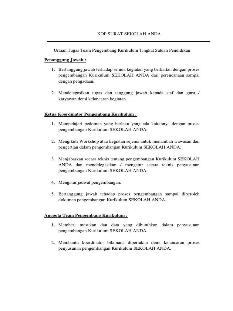 Merancang desain implementasi skala terbatas (perintisan) kurikulum; Menyusun rekomendasi hasil dari implementasi skala terbatas (perintisan) kurikulum; Menganalisis kerangka acuan kebijakan kurikulum; Tpk merupakan kelompok kerja yang angkat dari unsur guru, wakasek, dan kepala sekolah yang disahkan dengan surat keputusan (sk) kepala sekolah. Format sk tim pengembang kurikulum sdmi tahun 20182019 ini merupakan file terbaru yang akan saya share pada kesempatan kali ini.